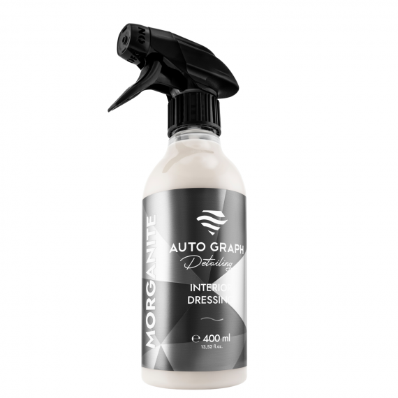 Dressing do zabezpieczenie deski rozdzielczej i pozostałych elementów plastikowych we wnętrzu samochodu. Chroni przed wpływem czynników zewnętrznych i promieniowania UV, dzięki czemu tworzy nie płowieją. Dodatkowo tworzy warstwę antystatyczną, która spowalnia proces osiada kurzu. Morganite pozostawia eleganckie, satynowe wykończenie. Przyciemnia, nasyca i pogłębia kolor. Po kontakcie z wodą nie pozostawia nieestetycznych zacieków.