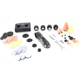 Zestaw polerski wielofunkcyjny: bezprzewodowa mini polerka rotacyjna i dual action EB210 wraz z głowicami, talerzami oporowymi, gąbkami, futrami, mikrofibrami i stożkami polerskimi, ładowarką, dwoma bateriami 2.5 Ah i zestawem przedłużek polerskich. Całość zamknięta w stylowej i wytrzymałej walizce.