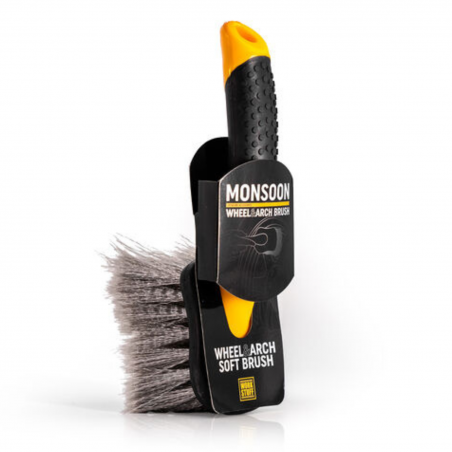 MONSOON to uniwersalna szczotka do kompleksowego mycia kół: felg, opon, nadkoli. Na wydajność i trwałość opon ma wpływ ich regularne czyszczenie, usuwanie kamieni, piasku i innych zanieczyszczeń jest więc kluczowe. Szczotka poradzi sobie również z uporczywym brudem, kurzem i osadem hamulcowym z felg aluminiowych i chromowanych. Dobrze spienia produkty czyszczące a jednocześnie jest odporna nawet na ciężką chemię. Średnio twarde włosie, lekko pofalowane i elastyczne posiada rozdwojone końcówki przez co jest na tyle delikatna, że nie spowoduje zarysowań i uszkodzeń. Nawet przy intensywnym szorowaniu włókna zachowują kształt i efektywność nawet po wielokrotnym użyciu, nie wygina się i nie gubi włosia. Monsoon nie posiada ostrych krawędzi, a plastikowe elementy osłonięte są gumą, więc nawet przypadkowo nie zarysujesz powierzchni. Na uwagę zasługują jej optymalne wymiary, jest kompaktowa, lekka i bardzo poręczna. Rękojeść pokryliśmy wypustkami i antypoślizgową, gumową powłoką, dzięki czemu nie wyślizgnie ci się z ręki nawet po zamoczeniu. Pamiętaj, aby po skończonej pracy opłukać szczotkę i pozostawić ją do wyschnięcia, możesz ją powiesić na haczyku co ułatwi ci otwór na końcu rękojeści .