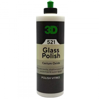 3D Glass Polish to środek polerski na bazie tlenku ceru przeznaczony do usuwania zawirowań, zadrapań, śladów wycieraczek i plam wodnych z powierzchni szyb samochodowych.